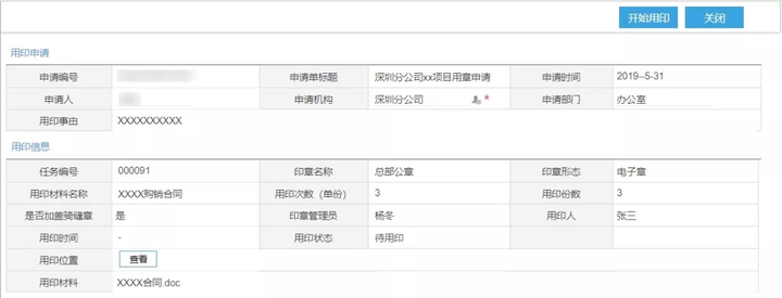 从流程入手,实现多种用印方式的统一管理,用印人提交用印申请/授权用印申请,申请通过审批后,用印人根据具体业务场景选用不同形态的印章用印,最后在用印过程中产生的所有记录和证据都会被汇总到统一的用印台账中,并提供多种维度的查询方式。
