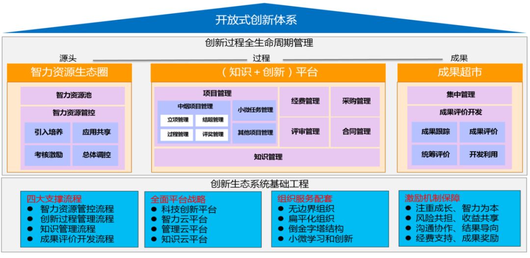 通过构建智力云、科技创新等平台,将知识管理、科技创新、运营管理进行深度融合,连接人才、流程、资源,让知识服务贯穿整个科技创新业务体系、运营管理体系,支撑技术中心、集团创新发展。