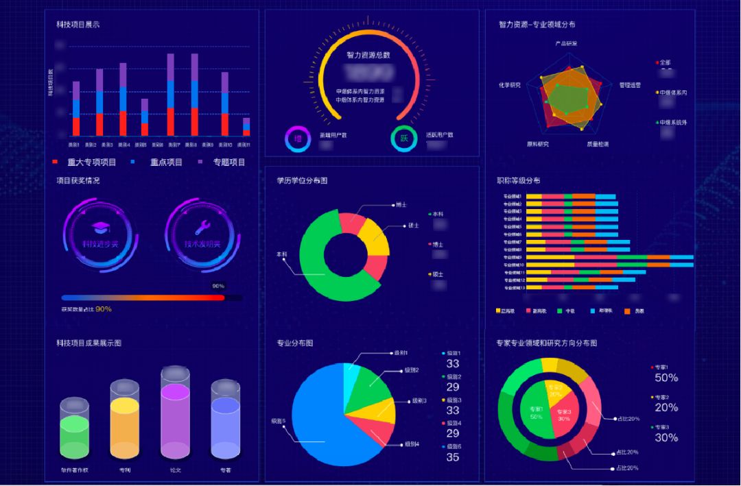 通过搭建数字大屏,对智力资源总数、科技项目成果、学历学位分布、专家专业领域和研究方向等多项信息进行全面、动态掌握,为技术中心的智力资源引进、智力资源培育提供重要参考。