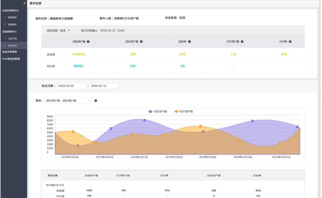 基于数果营销智能平台完成营销流程闭环,根据用户标签体系的用户特征,制定专属营销策略,打通从数据到营销的链条,实现目标群体精准触达,并进行效果监控分析。