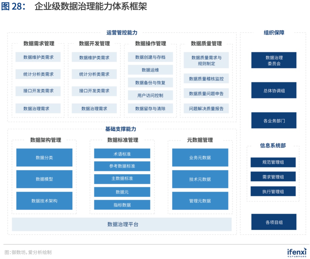 数据治理的需求是全局的,来自于企业管理层和业务部门,需要从管理层到业务层均采取行动,并优化其组织架构和业务体系。数据治理体系分为数据治理组织体系与数据治理能力体系。