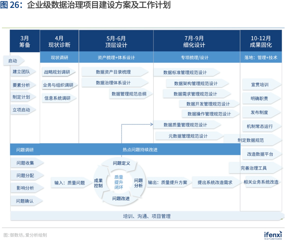 整体项目主要分为数据管理现状分析、数据质量根因分析、专项数据治理、数据治理体系建设等阶段,短期解决公司的业务实际问题,长期提升企业的数据管理能力。