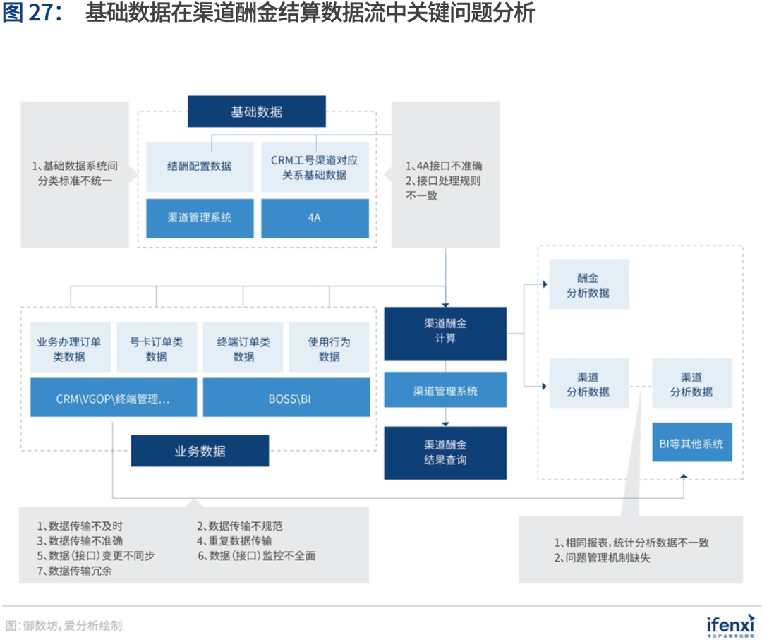在现状分析阶段,分别进行了顶层设计和具体业务问题的现状分析调研。项目组基于业务发展重要性及数据质量提升紧急性,优先选择家庭宽带和渠道两个模块,针对酬金结算不准和订单数据不准等场景作为切入点,对相关的5个系统累计进行13余次深入调研。