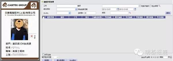 明基逐鹿针对铠胜集团的特殊需求,将一卡通功能融入eHR系统,当员工加班时间超过上限,或者一周上班天数超过上限,则无法刷卡计入考勤,陈帆春介绍,这是明基逐鹿额外为铠胜集团定制的功能模块,有效的控制了员工的加班时间。