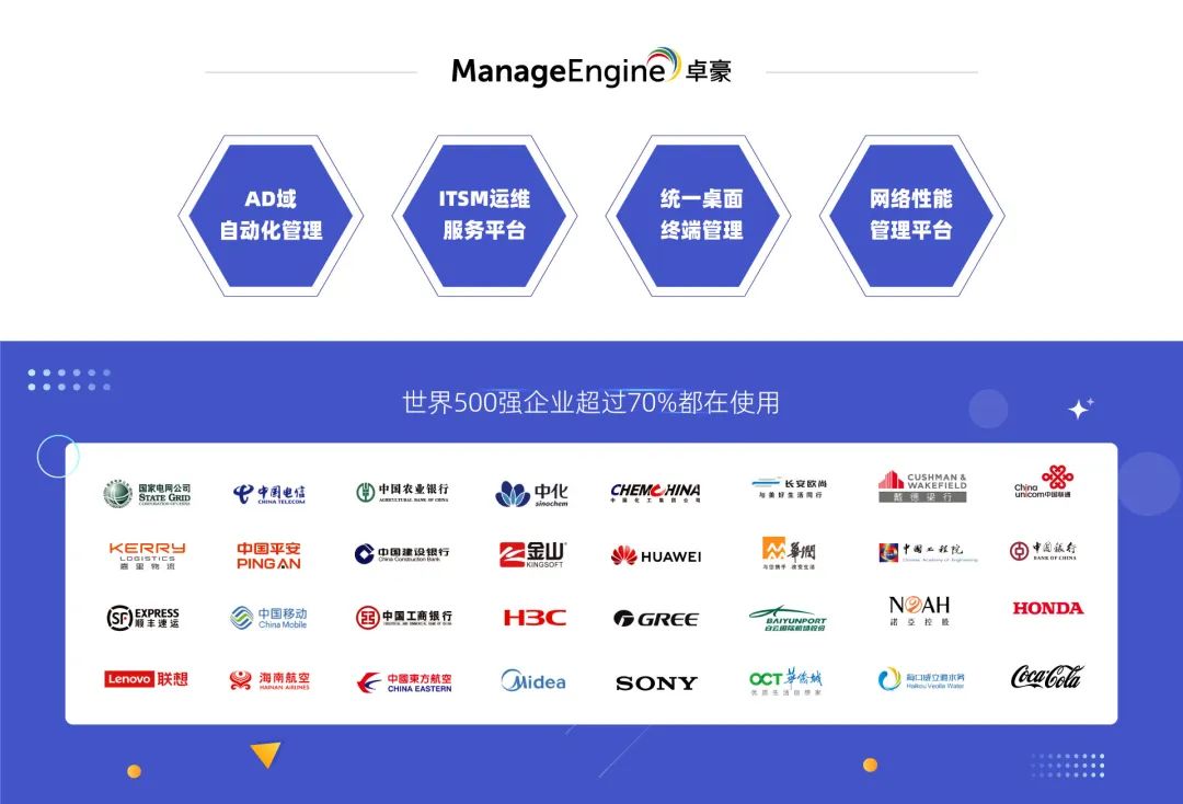 卓豪(zoho)于1996年成立,至今已稳定发展27年。世界500强企业超过70%都在使用ManagEngine卓豪产品;27年里坚持以技术为导向,以解决用户需求为出发点。投入海量的资金对全球用户的需求进行研发,实现用最先进的技术解决用户需求。因此,ManageEngine卓豪可以提供最前沿的技术为用户创造最大价值。
