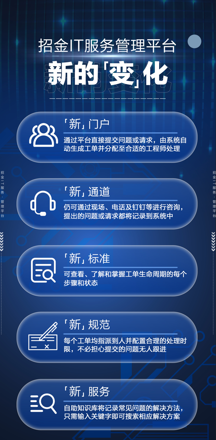 平台建设涵盖自助服务门户、服务目录、服务请求管理、服务级别管理、知识库管理等五大方面。,通过统一方便的方式,使招金矿业用户可以快速提交故障和请求, 我们建立了完整的问题和请求处理流程。用户可通过PC端、移动端、钉钉、邮件等方式,将故障和请求完整呈现在平台中。