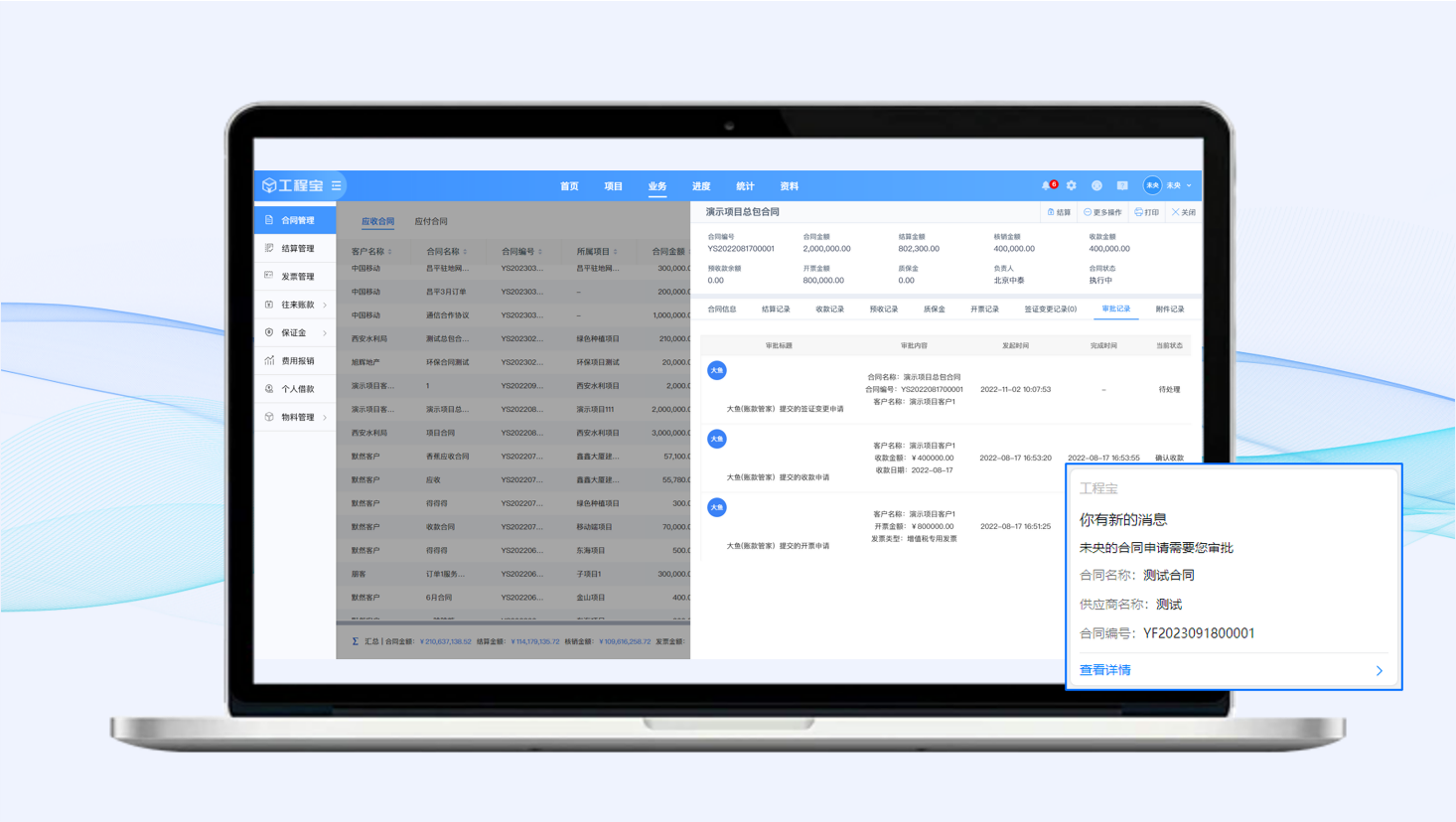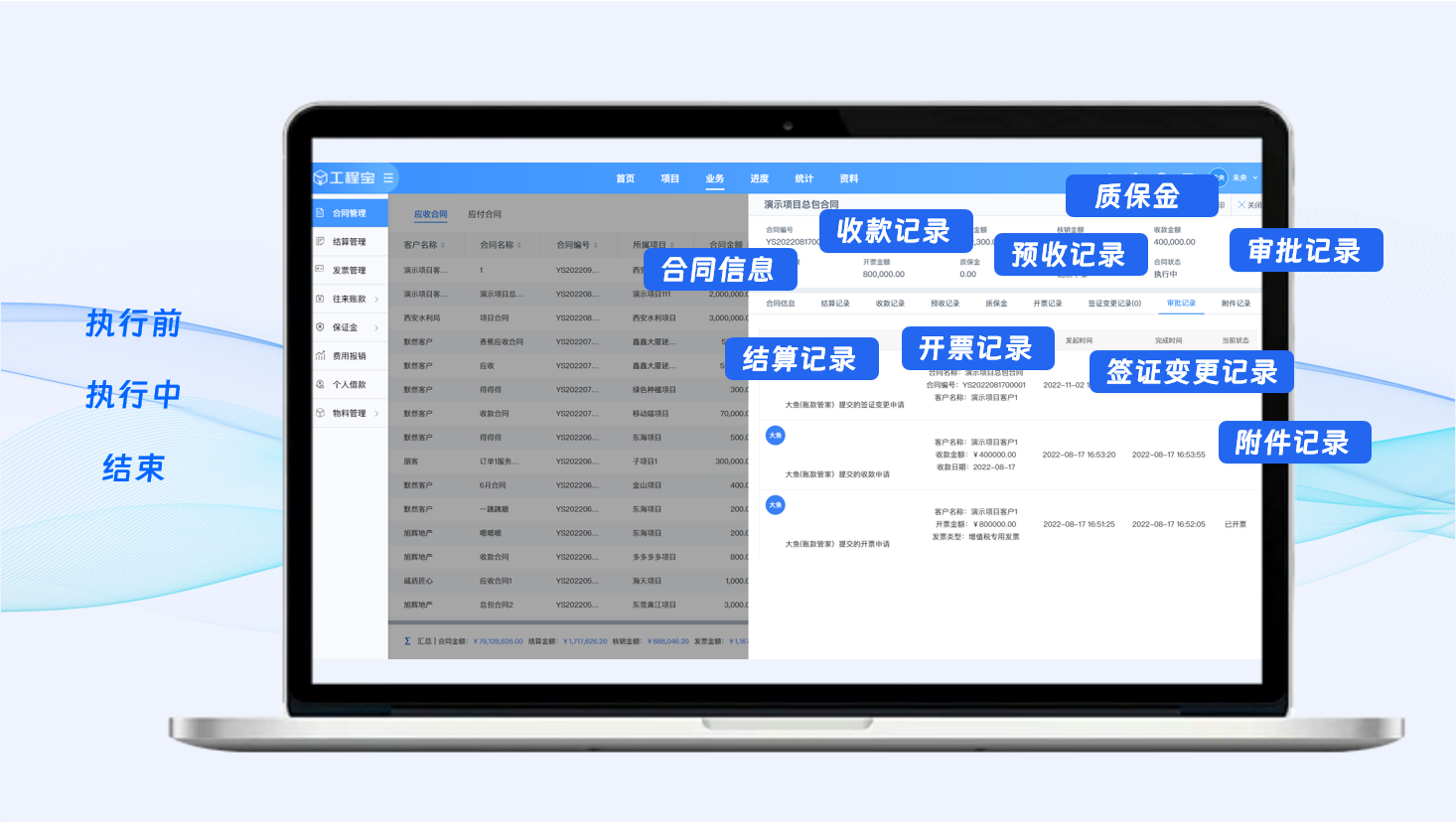 工程宝合同管理模块中,合同执行情况和操作记录一目了然,按照项目自动统计。列表页可以很清楚的展示客户名称、所属项目、签订金额、收/付款金额、发票金额等多项字段内容,支持筛选,十分便捷。