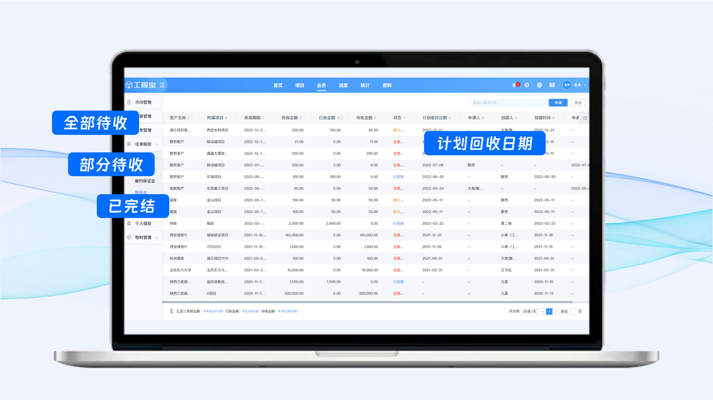 质保金、履约保证金均可设置计划收回日期,到期系统自动提醒相关负责人收回款项,每笔金额收回状态,收回金额等清晰展示,彻底告别漏收、忘收。