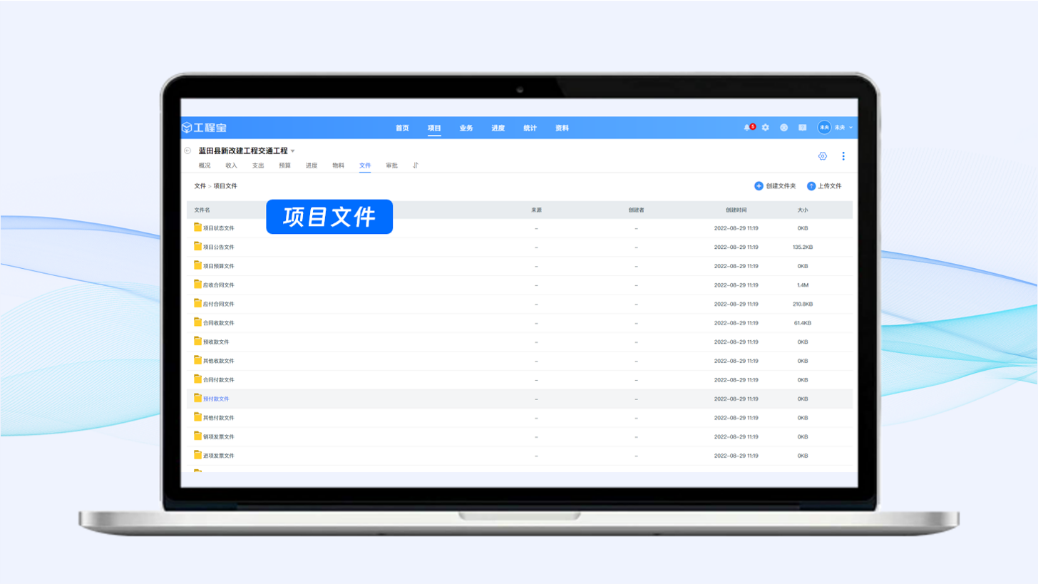 系统会将该项目的合同、结算、收/付款、发票等信息归结至项目文件中,可按所需新建文件夹或上传其他文件至项目中。