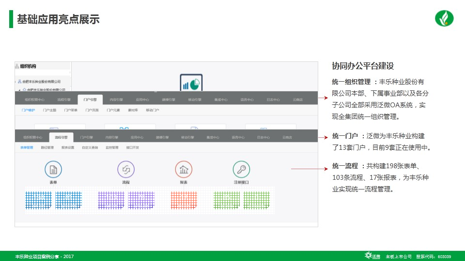 项目成功实施上线后,对于丰乐种业而言带来了巨大的管理价值。泛微为丰乐种业构建了13套门户,目前9套正在使用中,共构建198张表单、103条、17张报表,为丰乐种业实现统一流程管理。系统实现了与HR、NC系统的集成,实现了对整个集团费用的高度管控,为丰乐种业构建高效协同的办公平台。