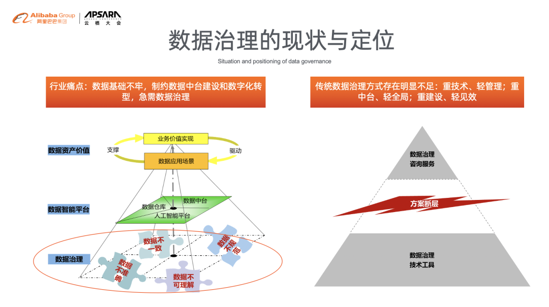 (讲话稿)现在各行各业数据化、智能化建设如火如荼,通过数据平台、数据应用实现开源节流、降本增效、风控合规等业务价值。但是所需面对的是过去二十年间存量信息系统和存量数据资产,数据存在着不可理解、不规范、不一致、不准确的数据问题,制约着数据价值的发挥,而数据治理正是解决各类数据问题、打好数据基础的重要工作。但是,我们发现市面上的传统数据治理方式还存在着显著的不足,咨询公司只提供咨询报告、落地难;技术工具公司更侧重于面向数据开发人员提供技术化的功能,缺少咨询方法论的指导,不适用于业务人员、数据管理人员,这两层方案中存在一个巨大的断层。为了解决这些传统数据治理模式的不足,我们形成了自身的数据治理场景化的软件平台DGOffice,并与阿里DataWorks建立了一体化的数据治理解决方案。
