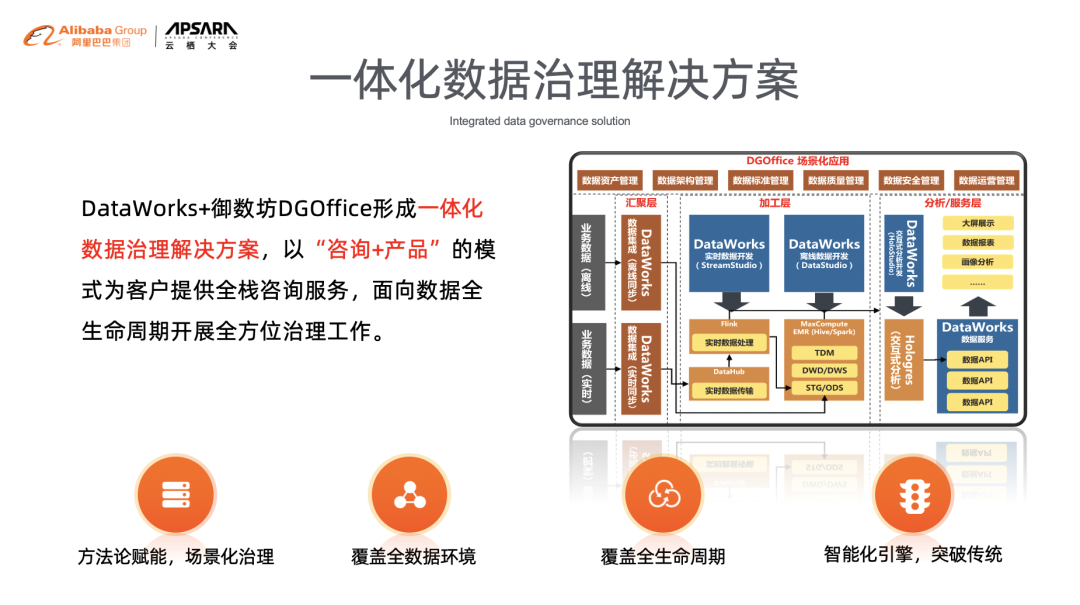 首先,数据治理一定要有方法论赋能,让数据治理产品实用;我们把多个行业上百个数据治理项目中积累的方法论沉淀为场景化的软件应用,让数据治理的小白用户都可以快速上手,让企业内业务、数据、IT人员的多类角色用户能够规范、高效协同。在这里,我们主要发挥DataWorks强技术属性以及DGOffice的业务和管理属性。