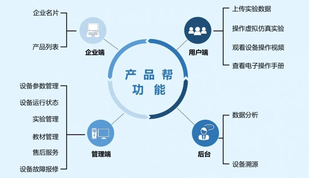 为解决上述问题,中广汇智潜心研发“产品帮平台”,针对产品生产商及集成销售商,利用全球统一编码及数字可视化技术,提供"设备赋码"、"企业信息展示"、"设备管理"、"电子说明书",并嵌入"实验操作模块"、"移动教学资源"、"手机端虚拟仿真"等功能模块扩展服务。