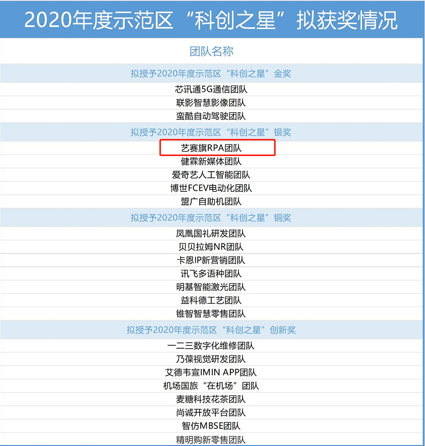 贯彻落实党的十九届五中全会精神,推进科技创新,为经济高质量发展赋能,同时加快长宁区科技创新人才集聚区建设,充分发挥临空经济示范区高层次人才的引领、示范和带动作用,根据《关于申报2020年度上海虹桥临空经济示范区“科创之星”评选活动的通知》要求,经公开自主申报、项目初审、专家评审等环节,拟对芯讯通5G通信团队等3个团队授予2020年度示范区“科创之星”金奖;拟对艺赛旗RPA团队等5个团队授予2020年度示范区“科创之星”银奖;拟对凤凰国礼研发团队等7个团队授予2020年度示范区“科创之星”铜奖;拟对一二三数字化维修团队等8个团队授予2020年度示范区“科创之星”创新奖。为进一步接受社会监督,现对拟表彰项目名单予以公示。
