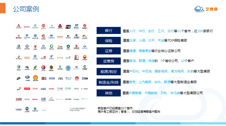 目前艺赛旗典型客户已覆盖31个省市,例如,浦发银行、华夏银行、广发银行、工银亚洲、太保、人保、海通证券、中国移动、中石化、南方电网、华为等知名企业。赋能的场景包括,银行、保险、证券、运营商、能源、电力、制造等行业。市场以及技术合作伙伴已超过500多家。