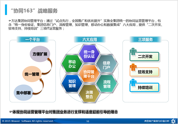 万达集团协同管理平台的建设,提升平台对领导及管理层的智能决策支持能力,提升跨地域、多元化经营的集团信息与服务共享能力,提升快速扩张、规模经营战略下的标准化管理与人才复制能力,提升关键项目、事务事前、事中风险预警控制能力,提升组织自我学习、自我管理及持续优化能力。